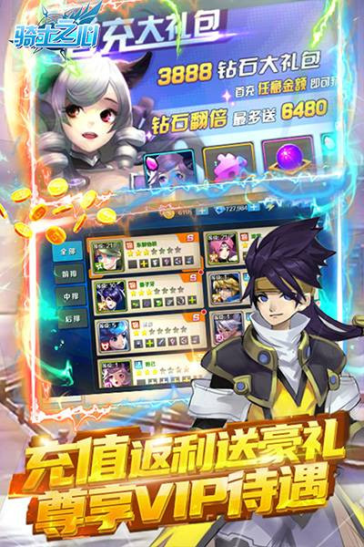 《骑士之心》游戏中,你可以根据不同的角色进行合理搭配,打造最强阵容,发挥最高的战斗力。各具特色的伙伴,炫酷大招超酷技能,让你体验超爽打击感。无比轻松的放置战斗,选择好阵容以及地图即可累积丰富收益以策略对付强大的怪物。极具特色的可爱萌宠,炫酷的装扮,打造不一样的主角。在游戏内收集兑换各种装备法宝,提升你的战斗力,斩破阻碍。神话与科幻色彩的结合,科技风满满的角色模型。你将带领队伍踏上封神之路,迎接新的挑战。