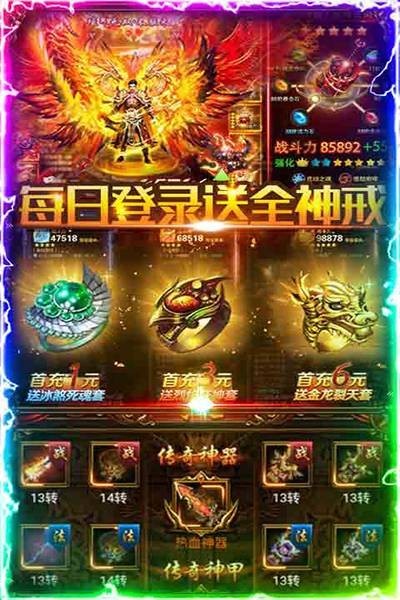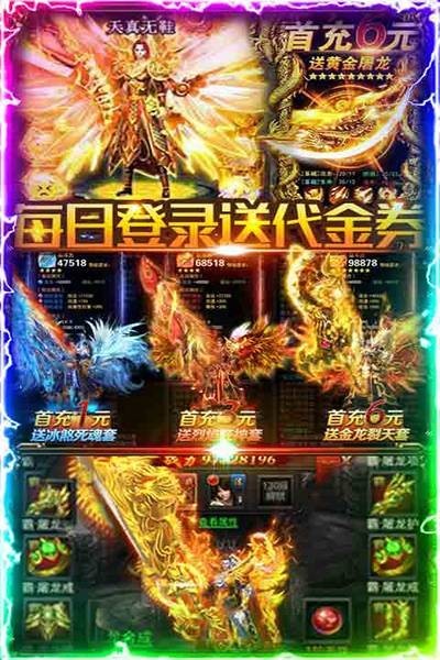 《热血龙城-免费充值》是一款全新大型放置类传奇游戏,首充立即开启免费充值功能!免费充值激活任意奖励!!!游戏还拥有精致的画面和炫丽的技能效果,三职融合,战士带狗,极致攻伤,一刀致命!PK打宝战沙城,热血豪杰闯天下!游戏内Boss超多,打完后还可以挖掘Boss出钻石,装备爆率高可回收百万钻石。龙皇秘宝还可以出热血神装,神装技能焚天灭地斩全屏爆龙。除此之外还有土豪装备,左手神兵灭霸手套等超多装备法宝。兄弟在聚热血争沙,赶紧和兄弟们一起进服吧!