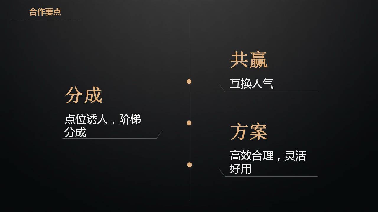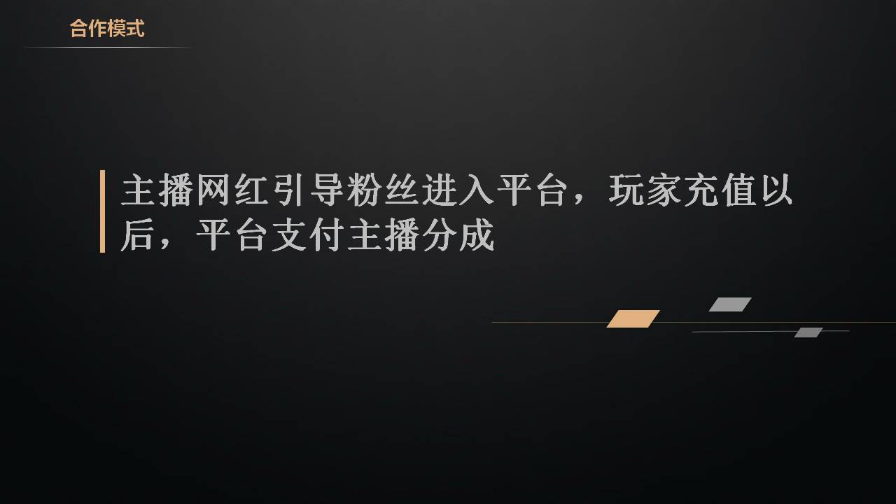 合作要点,首先分成点位诱人,阶梯分成。其次谈主播跟公会就不一样,主播都比较注重自己的粉丝,要共赢,可以互换人气的,咱们的平台都会有直播的功能,盒子也可以直播,邀请你到我们的盒子直播,或者直接在我们平台挂上你直播的地址,让玩家一边玩游戏一边看直播,这样你把你的粉丝引导到我的平台玩游戏,我把我平台的玩家引导去看你的直播,互换人气达成共赢。我们还要准备好一套方案,因为到目前为止还是有很多的小主播都不懂甚至都不会玩游戏,平时就只唱唱歌聊聊天,她看不到游戏里快速流量变现的这种方式,所以要准备一套很好的合作方案,刚开始他可能看不上分成,那就给她刷刷礼物,要灵活变通,因为刷礼物比给钱让她高兴,刷礼物能顶榜,能吸引更多的人气,可以跟她谈,方案一定要合适,灵活好用。