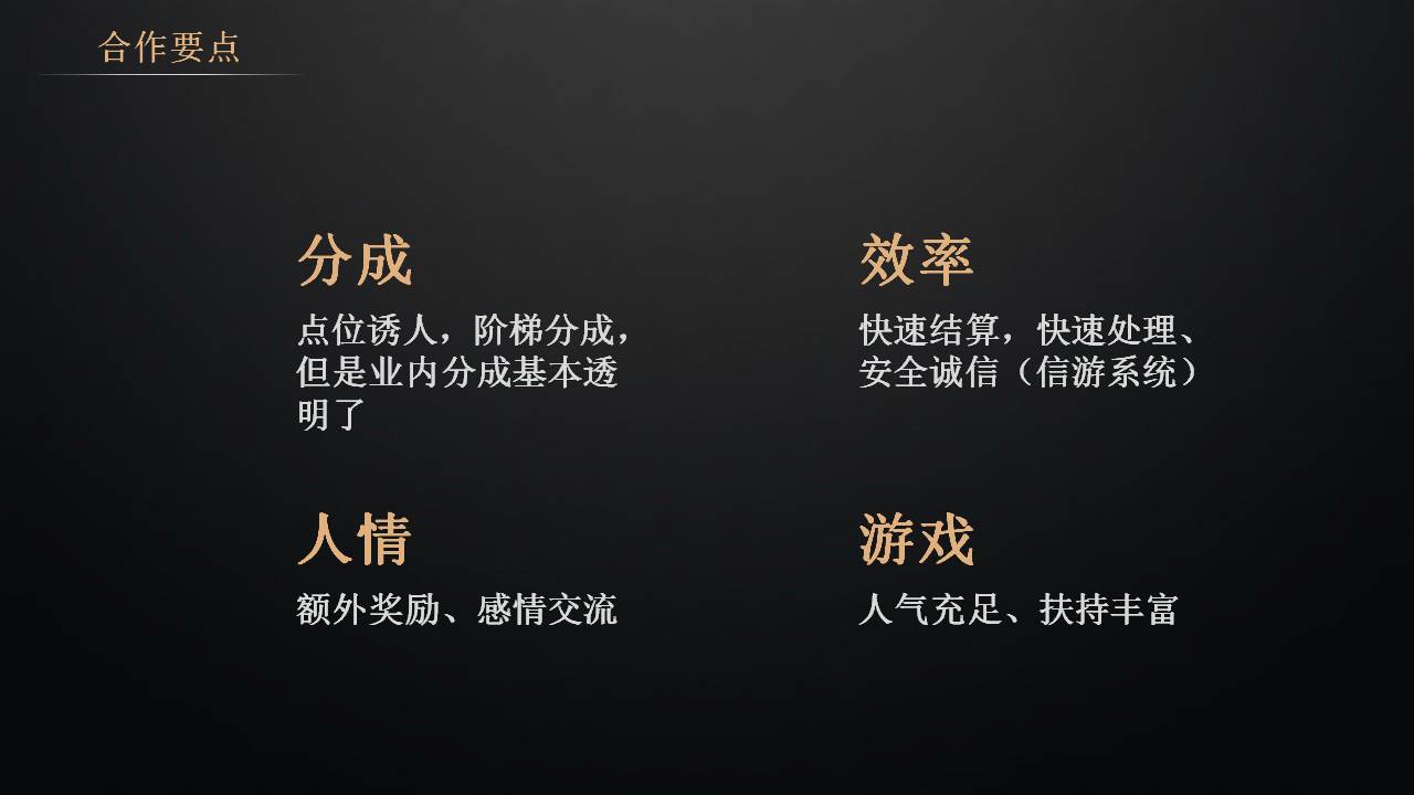 那么我们怎么样高效的跟公会达成合作呢?公会长为什么要跟你合作,你可能是个新平台,一无所有。首先我们讲要点位诱人,利益最重要,他做公会做工作室,就是为了赚钱,那我们给他足够的分成,甚至给他阶梯分成,跳点。跳点要特别说一下,不要一上来大平台、小平台都给高点位,这样会很赔钱,我们给小公会新公会点位偏低,但是做到一定流水之后,可以给非常高的点位,这样公会也更有积极性。比如最开始给50 ,如果他一个月后达到十几万流水,我可以给他跳点,给他80甚至90个点,使劲的跳个点,这样他会非常的有动力。第二是效率,谈公会,公会讲究快速结算、快速处理、安全诚信。公会跟平台合作,如果点位他很满意以后,就需要结算了,要保证他的钱可以结算,他要月结周结日结甚至秒结。像信游的后台就可以实行自主提现,随时都可以提,这样呢公会就会比较愿意,他感觉这个钱是攥在自己的手里,能不能快速的帮他完成提现,还有黑不黑单,安全诚信这点很重要。不要去黑公会的单,你感觉不给他结算一把就可以赚他一笔,但是这样时间长了口碑就会很差。再其次就是人情,额外的奖励和感情的交流。因为分成的点位、结算的处理,这些是平台只要他想做就能做的,那么同样的平台同样的点位同样的办事效率为什么会选择跟你合作呢,这时就需要额外的奖励,多给点其他的东西,不一定是钱,送点礼物或者别的什么都可以,先把会长圈起来交上朋友,感情交流,变成朋友没准亏两个点位他也愿意跟你合作,因为公会的人一般都比较讲义气,只要你的感情哥们义气到位了,你的事情就好商量、就什么都好办。还有就是游戏,你的产品好推广,帮助公会快速的变现,人气充足,扶持丰富就是内部账号,这样下来公会谈合作就比较容易了。点位高,效率搞,人情铁,游戏也不错那就没道理不跟你合作呀,这就是合作的要点。