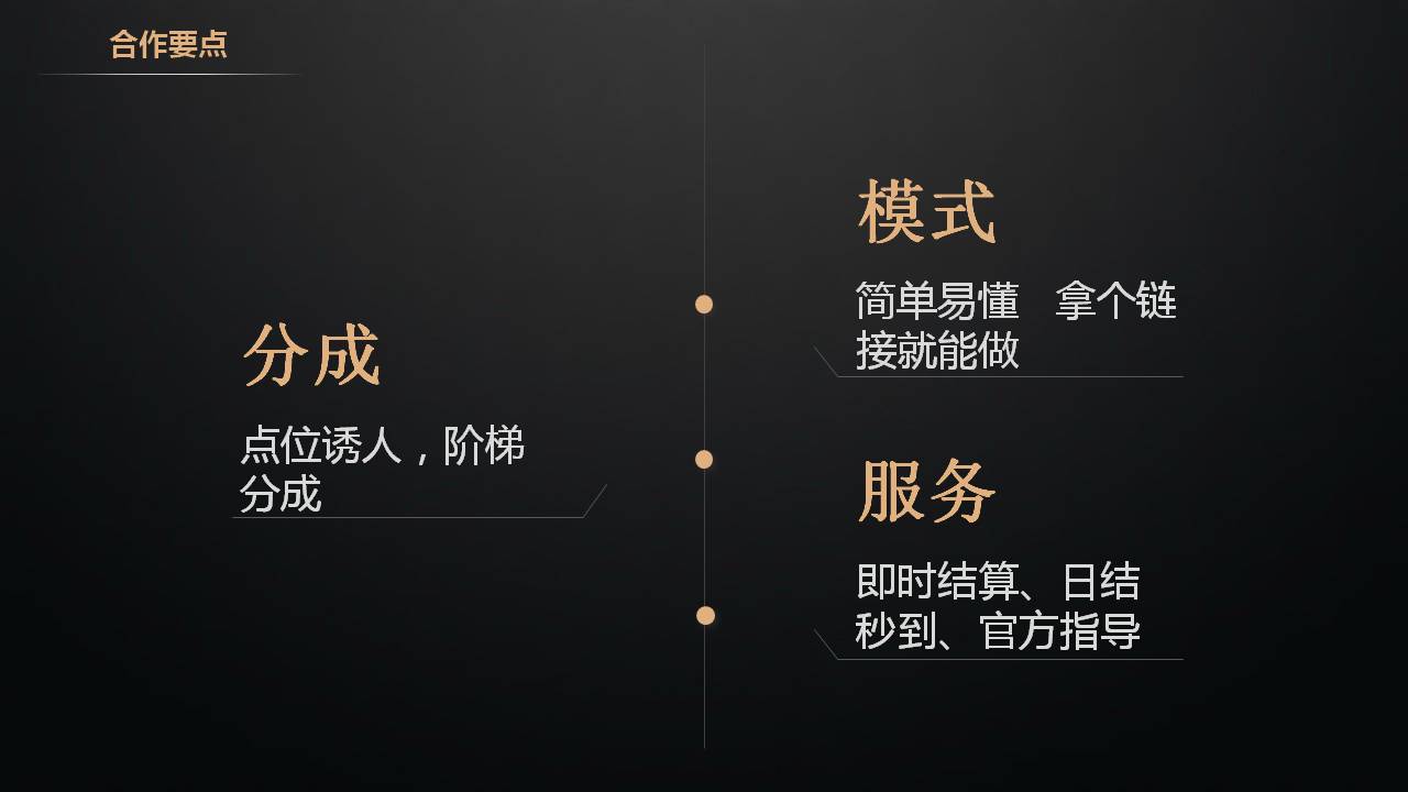 加盟商合作要点,分成点位诱人,阶梯分成,咱们一直在强调阶梯分成,因为CPS合作的就是分成。其次呢模式要简单易懂,拿个链接就可以做,宣传就是一键代理几百款游戏,只要他把链接发出去别人点他的链接进游戏就可以了。我们还要提高服务,即时结算,日结秒到,加上官方指导,我们自己也在帮你做宣传,帮你推广,你就成为我们的加盟商,月入百万不是梦。很多人就是看到这种广告入行的,做了一段时间才发现自己做的是推广而不是运营,很多人都有做游戏的梦,但是他们不太清楚用户的重要性,能给他分成他就很高兴了。咱们就是这样去做加盟的宣传,吸引推广员。
