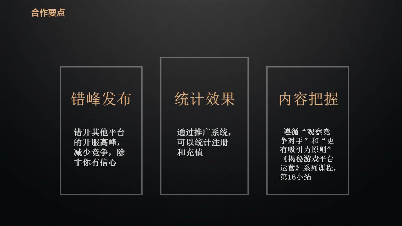 合作要点:错峰发布,错开其他运营商的开服高峰,减少竞争,除非你有信心。统计效果,每个开服表发布的注册链接,均为推广链接,我们可以统计注册和充值,效果好的我们就可以做他的付费广告,更好的提升咱们的效果。内容把握,遵循“观察竞争对手”和“更有吸引力原则”,不了解的可以看《揭秘游戏平台运营》系列课程,第16小结。