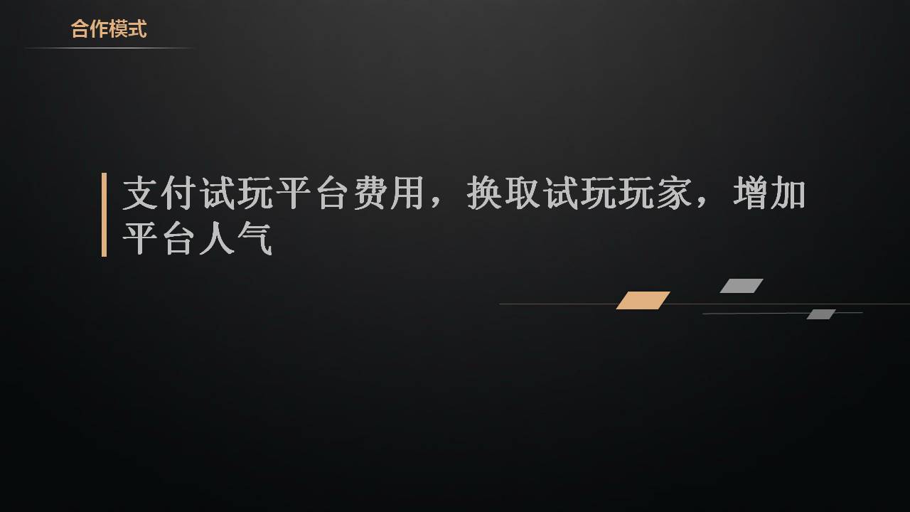 合作模式:支付试玩平台费用,换取试玩玩家,增加平台人气。试玩说白了就是花钱雇人顶人气的。像前面说的开服表、公会、主播、网站这些来的都是真实玩家,但是量不是很集中也不是很多,容易造成开服了就几个人,玩着没意思,这时就需要找试玩平台导一些试玩的玩家,试玩平台会发布一些任务,玩到多少级可以领他们网站的金币积分这些,可以兑换一些奖品。这些费用需要我们支付给他。这些玩家来的目的不是为了玩游戏,是为了赚取奖金。但是他们可以给咱们平台短时间内增加大量人气,这样真实玩家看着游戏中人比较多,他就会该充钱充钱,该练级练级,玩着也比较有意思。